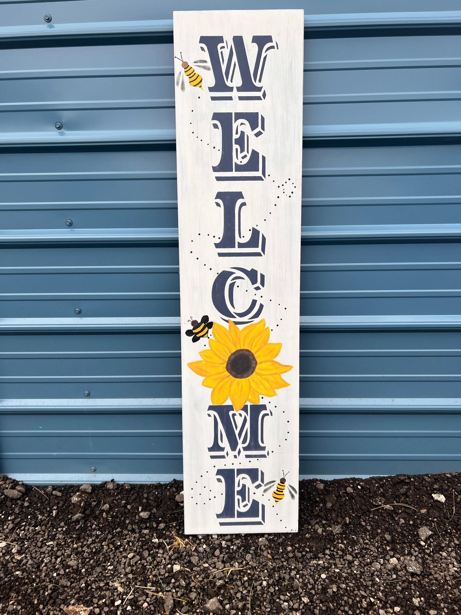 Welcome to the buzzing world of our 4ft Welcome Sunflower and Bees Porch Leaner! This durable board features a beautiful sunflower surrounded by busy bees, double-sealed with Polyacrylic for maximum protection - so it'll last for years to come. Spruce up your porch with this one-of-a-kind wall leaner and brighten up your home with a dash of sunny charm!