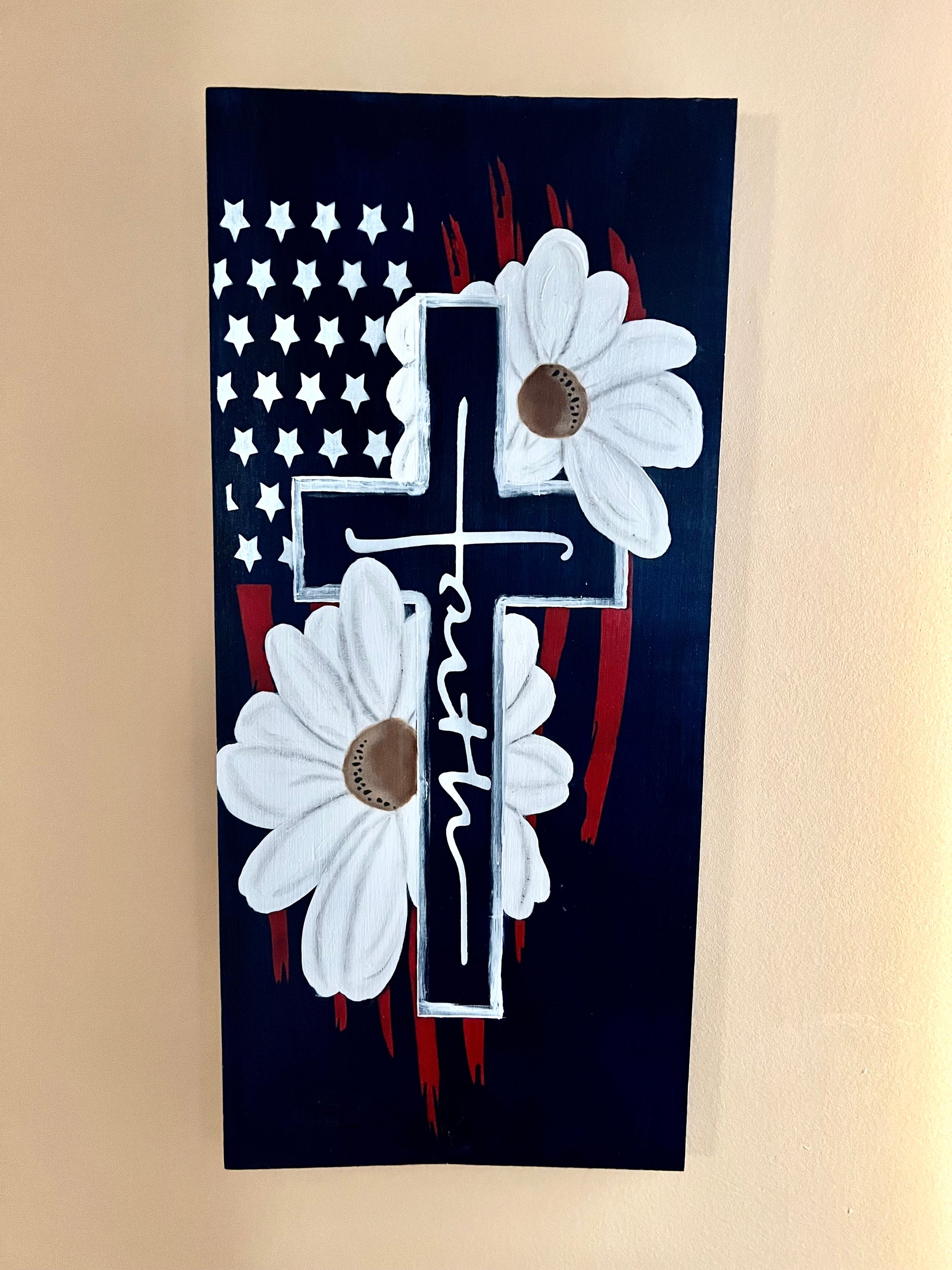 Faith board with cross, flag and daisy.