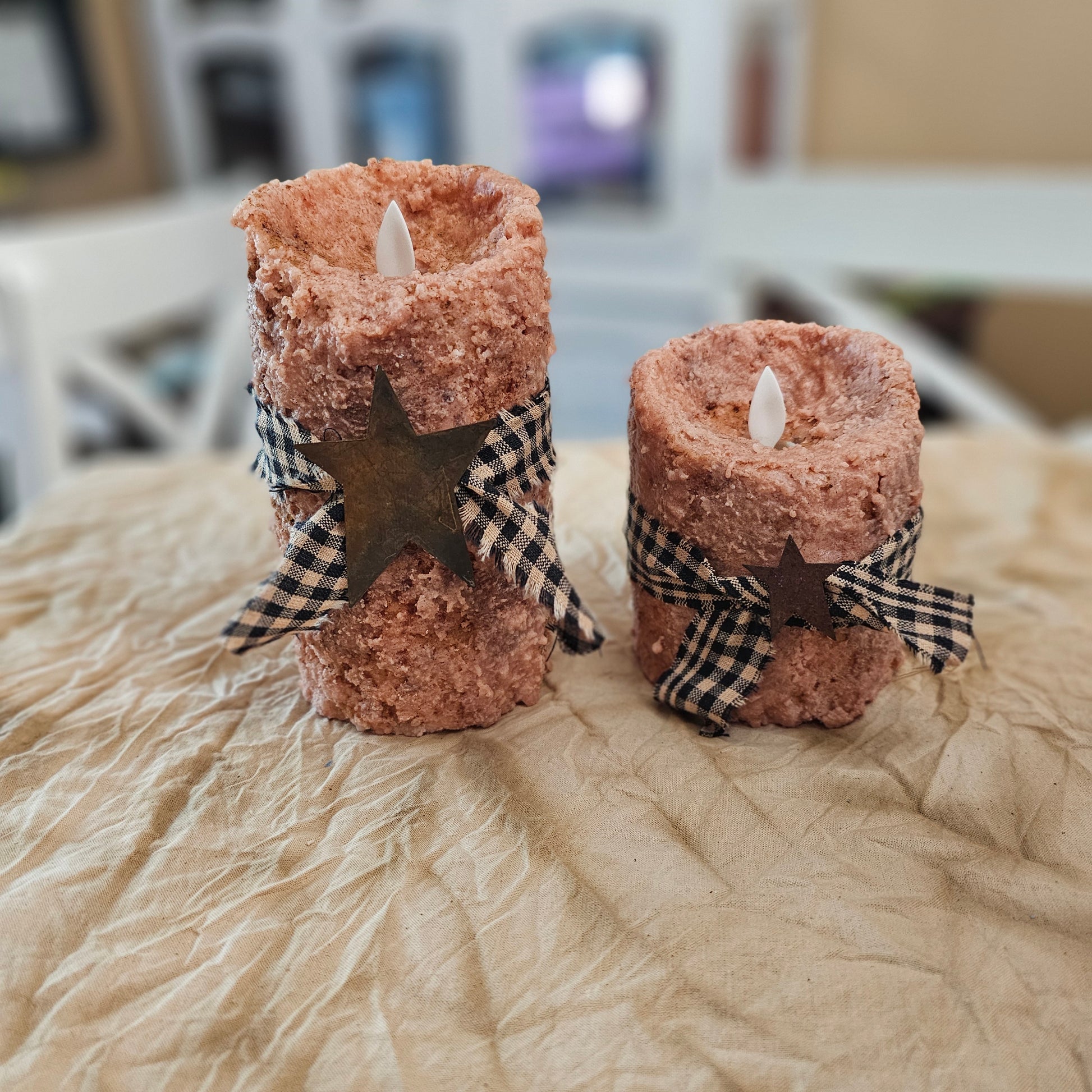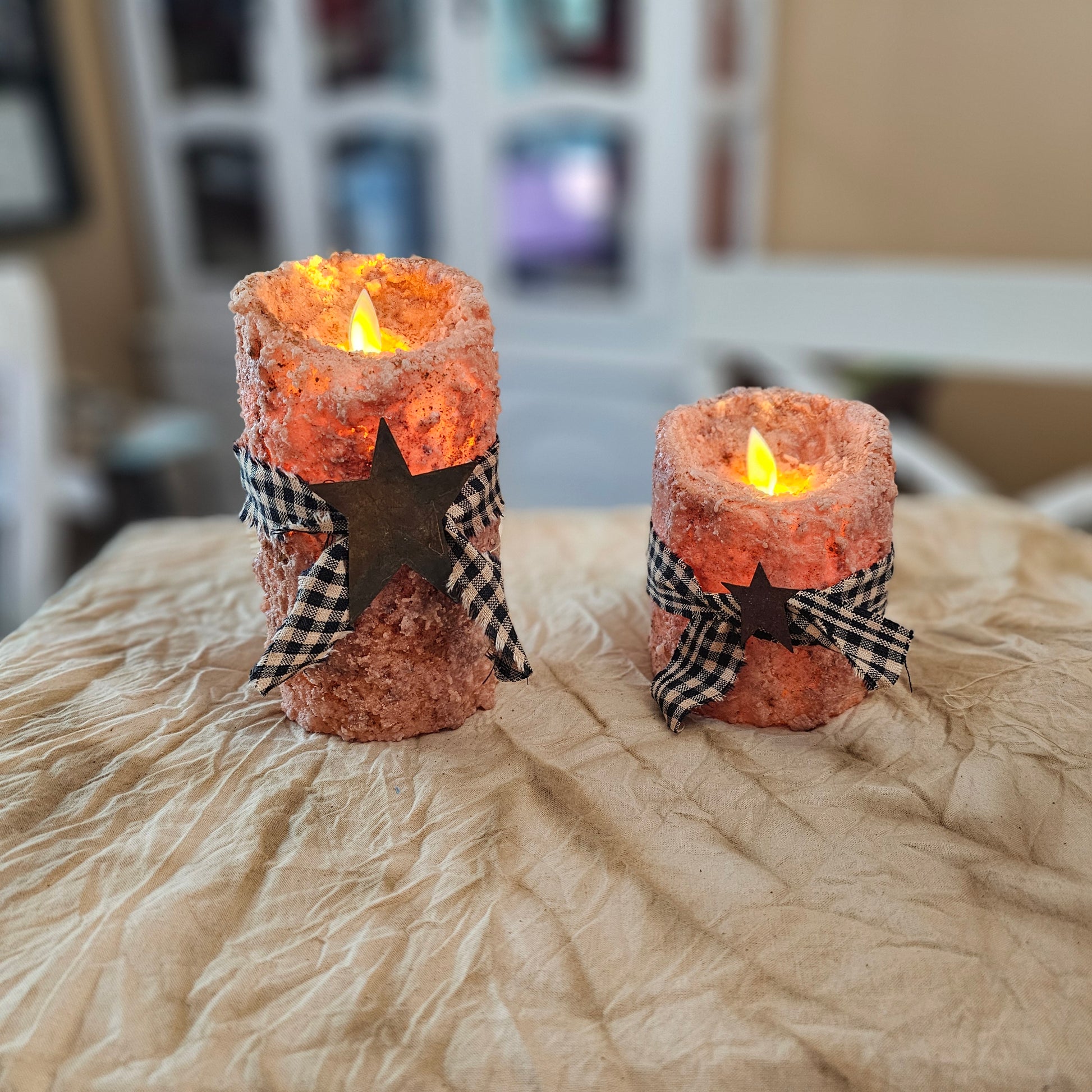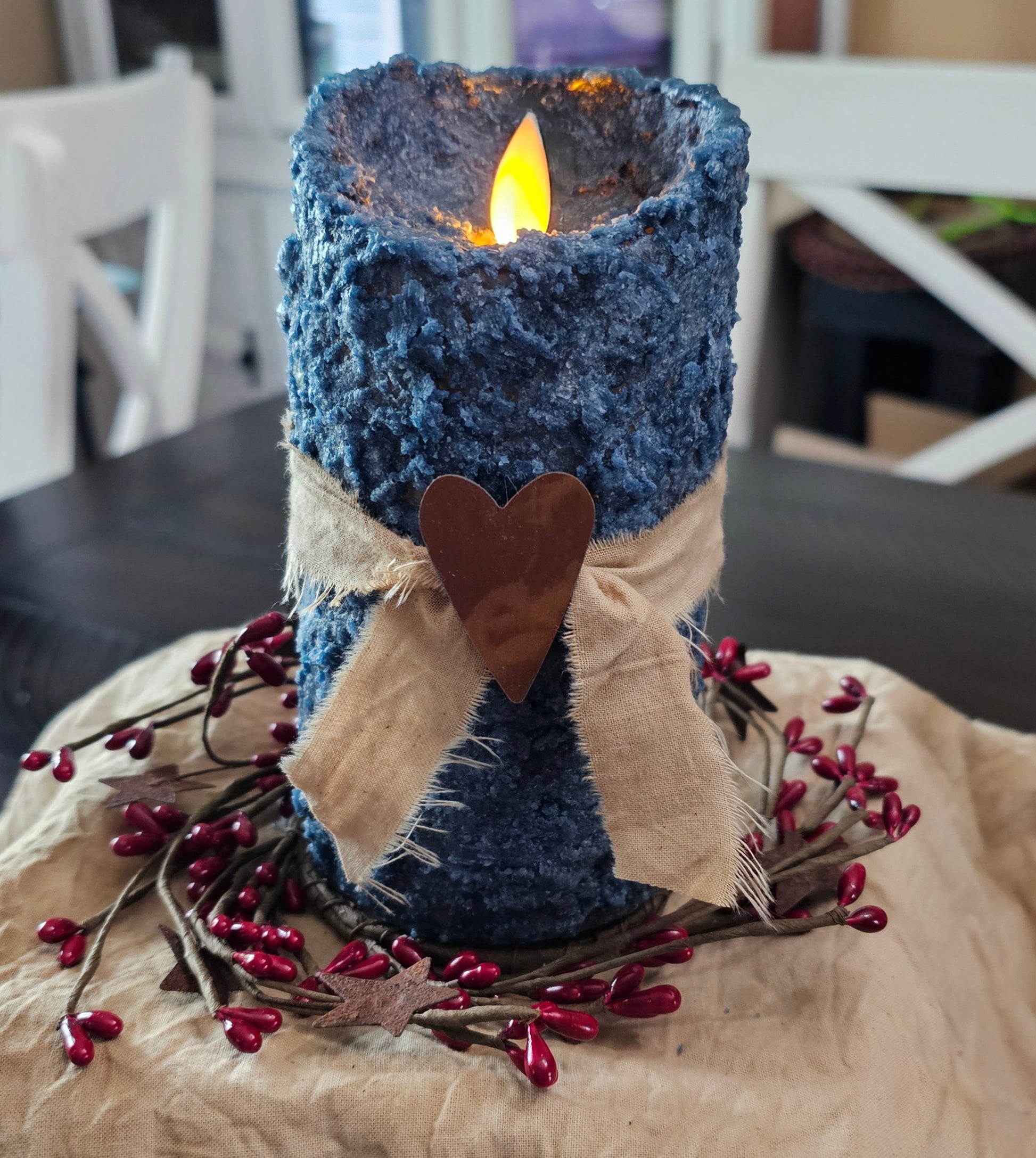 Primitive Handmade timered moving flame LED candle. Grubby candles, Primitive candles, farmhouse candles, timer candles, battery operated candles.