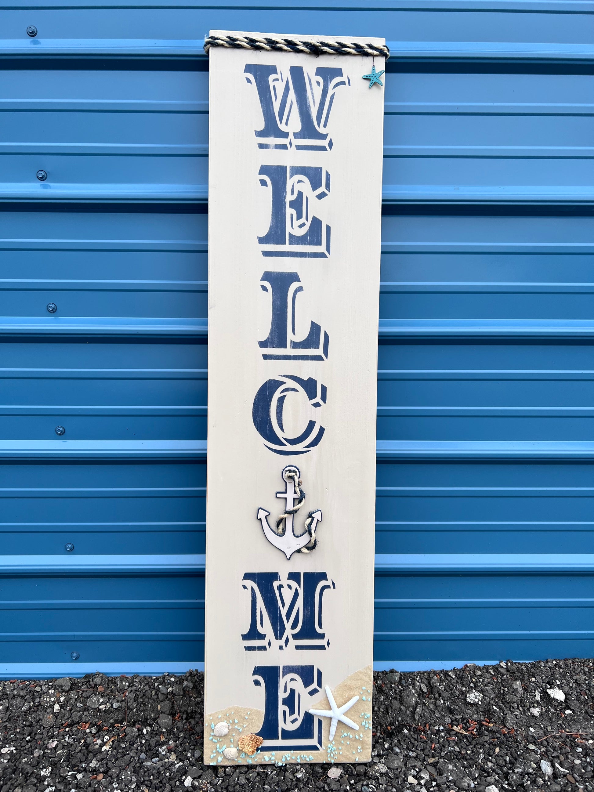 Experience the majestic shore of your own porch with this delightful 'Welcome Nautical Porch Leaner'! It features a beautiful blue/white rope at the top, a sand background with bold blue lettering, and a unique wood anchor to bring the entire look together. Drift away with the realistic sand, seashells, and starfish at the bottom! Home decor never looked so good!